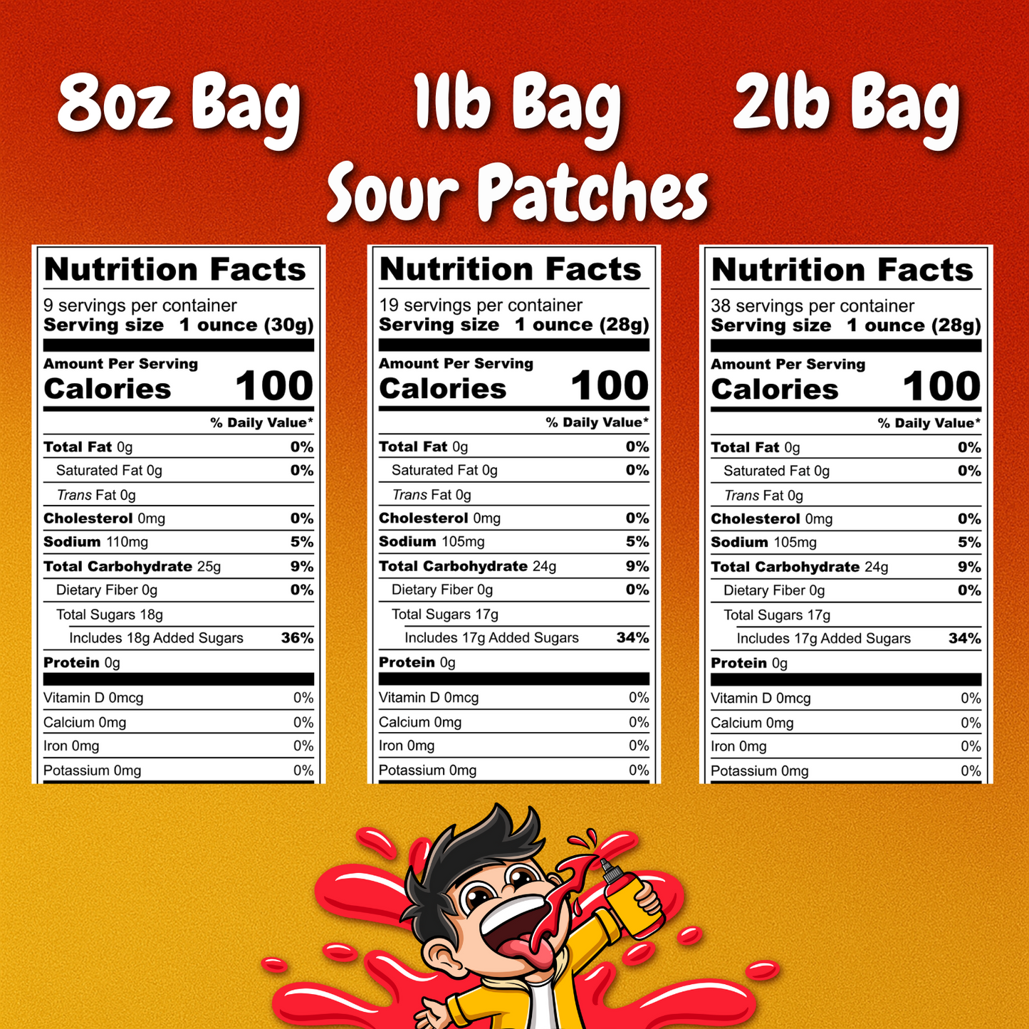 Each bag of Sour Patch Kids is loaded with sticky, mouthwatering flavor and soaked in our homemade Chamoy. You get one fat bag in 8oz, 1lb, or 2lb. Just pick your size and go crazy.