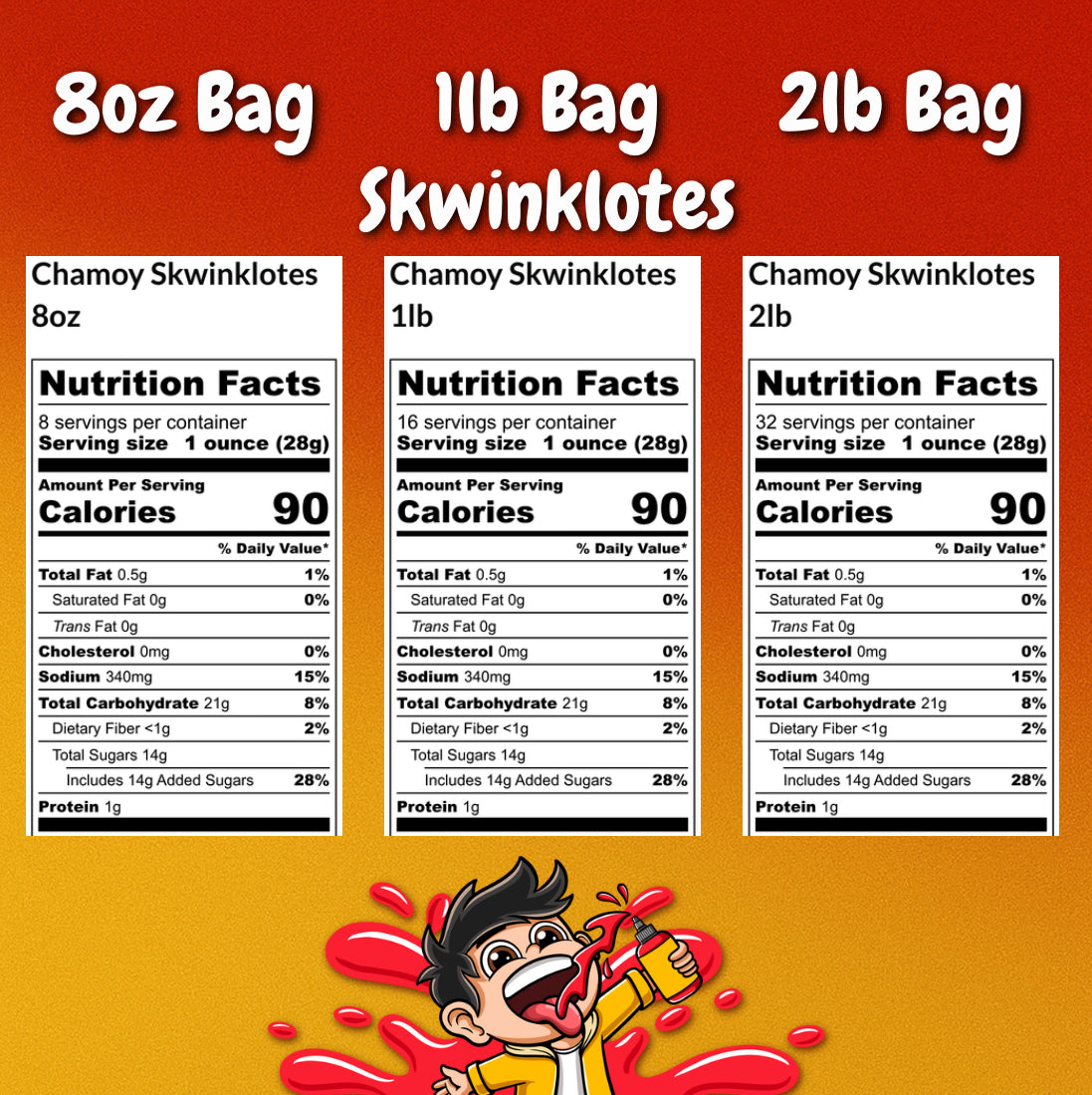Each bag of Skwinklotes is loaded with sticky, mouthwatering flavor and soaked in our homemade Chamoy. You get one fat bag in 8oz, 1lb, or 2lb. Just pick your size and go crazy.