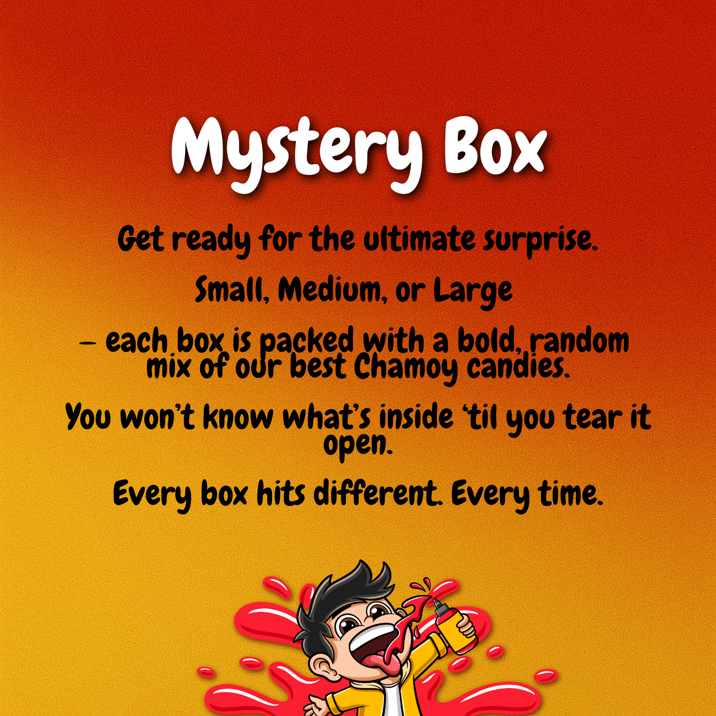 This one’s for the real ones — the curious, the bold, the can’t-pick-just-one type. Our Mystery Box is a surprise-packed bundle of our juicy Chamoy favorites, handpicked just for you. Whether you grab a Small, Medium, or Large, each box is freshly packed with care, flavor, and a whole lotta love.